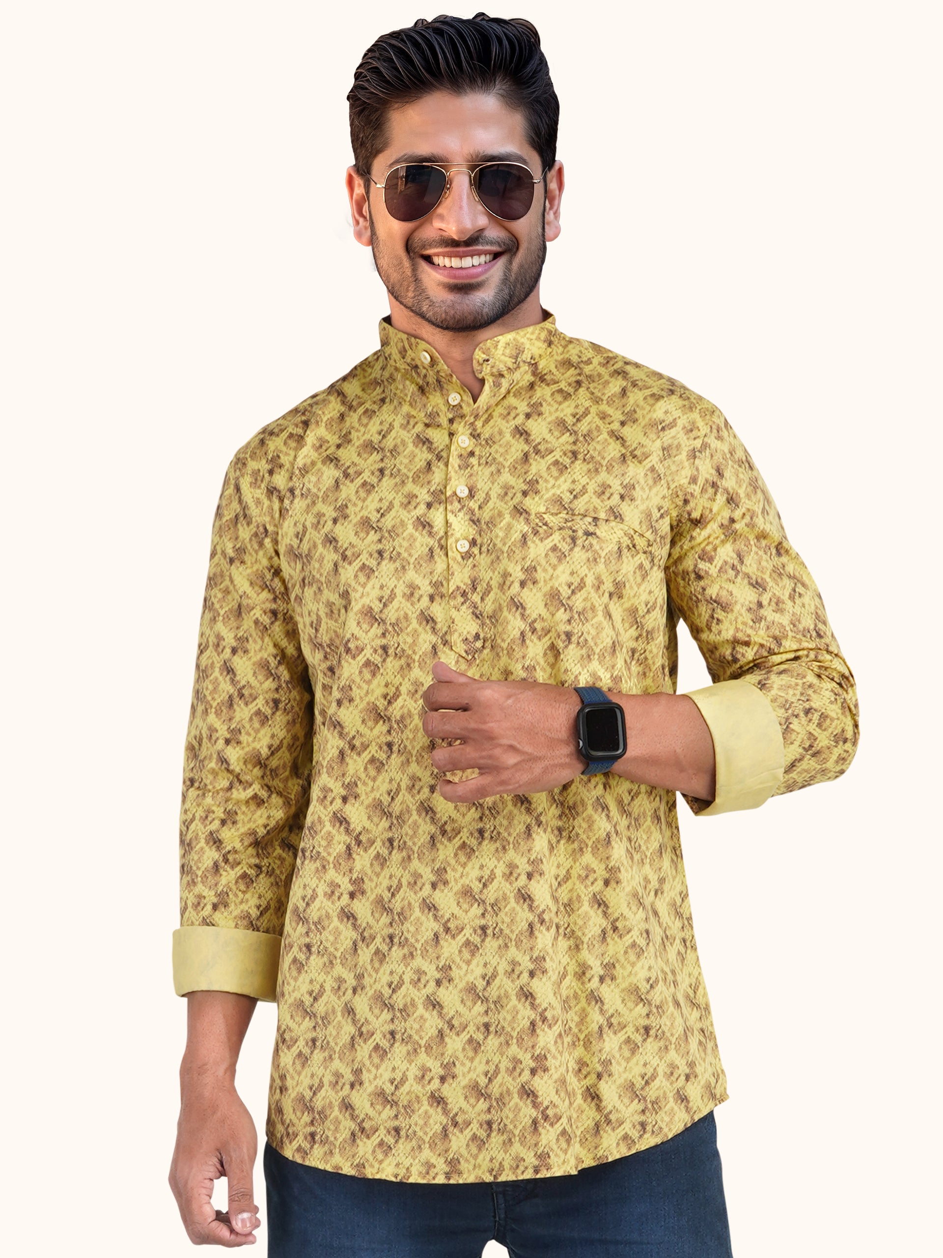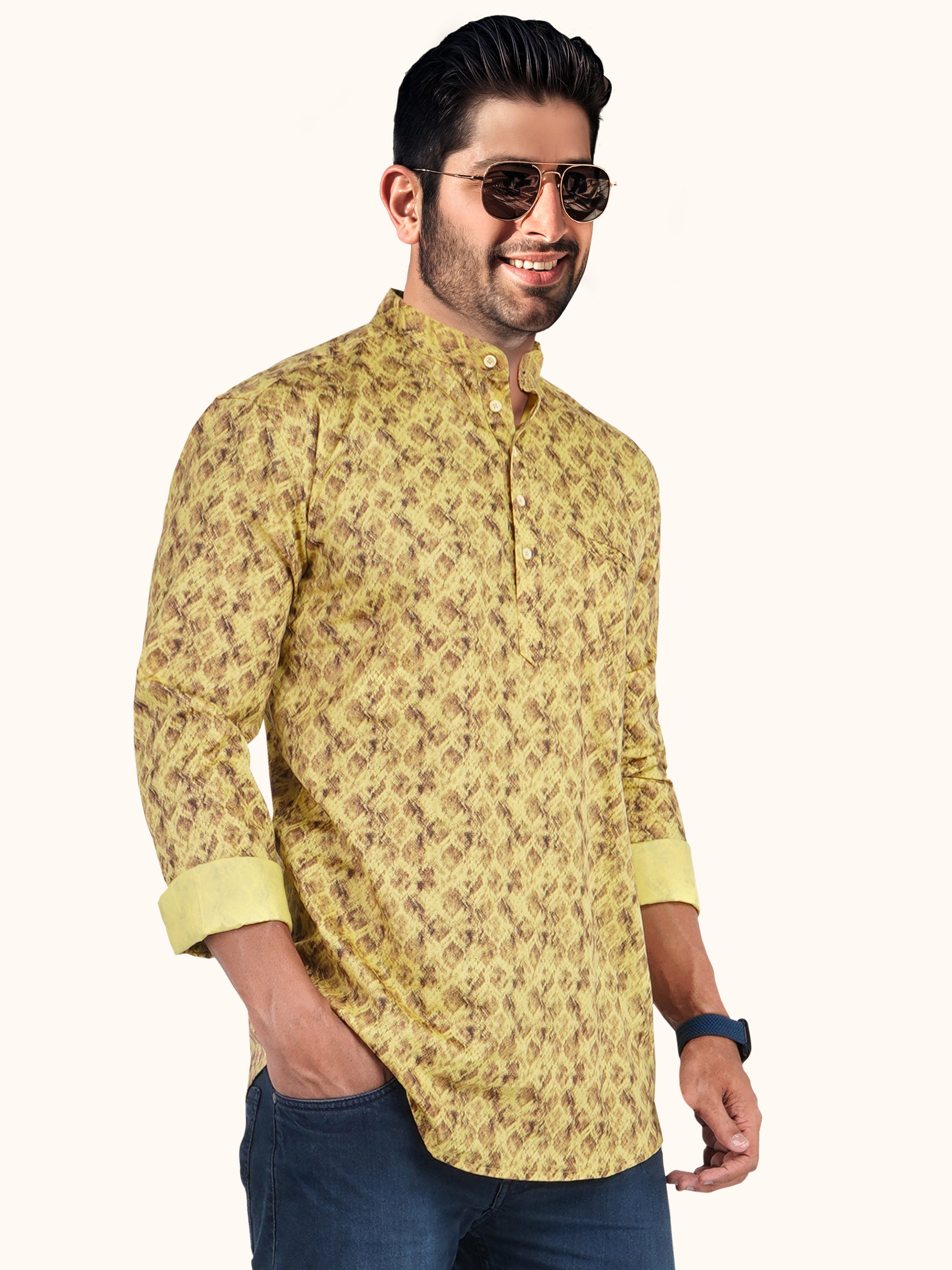 MENS COTTON YELLOW PRINTED SLIM FIT SHORT KURTA
