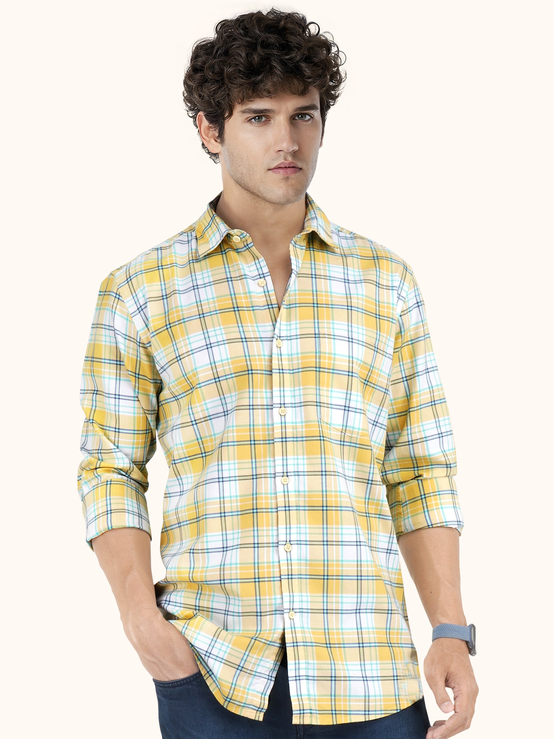 MENS COTTON YELLOW CHECKERED SLIM FIT FULL SLEEVE CASUAL SHIRT