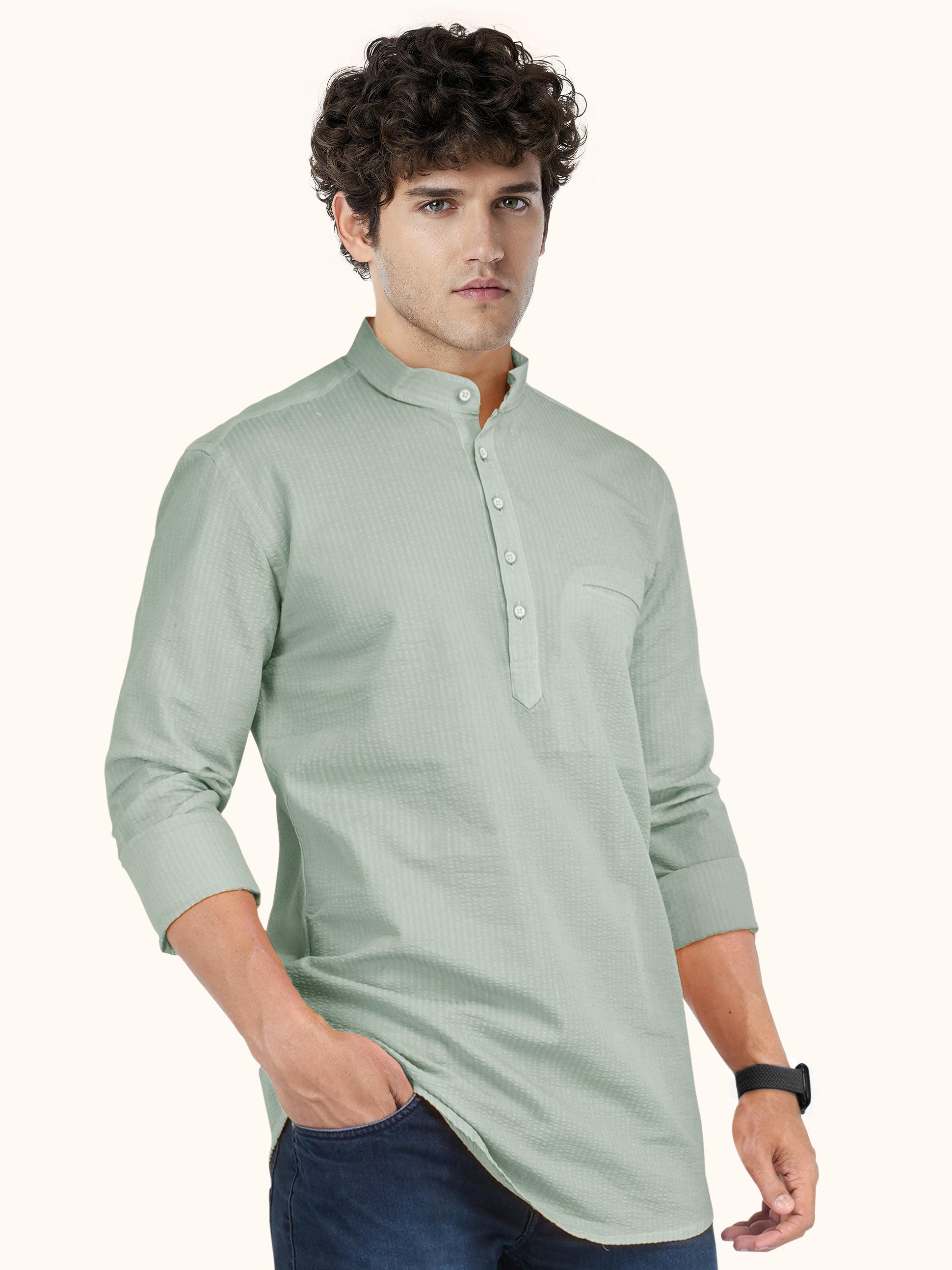 MENS POPCORN GREEN PLAIN SLIM FIT SHORT KURTA